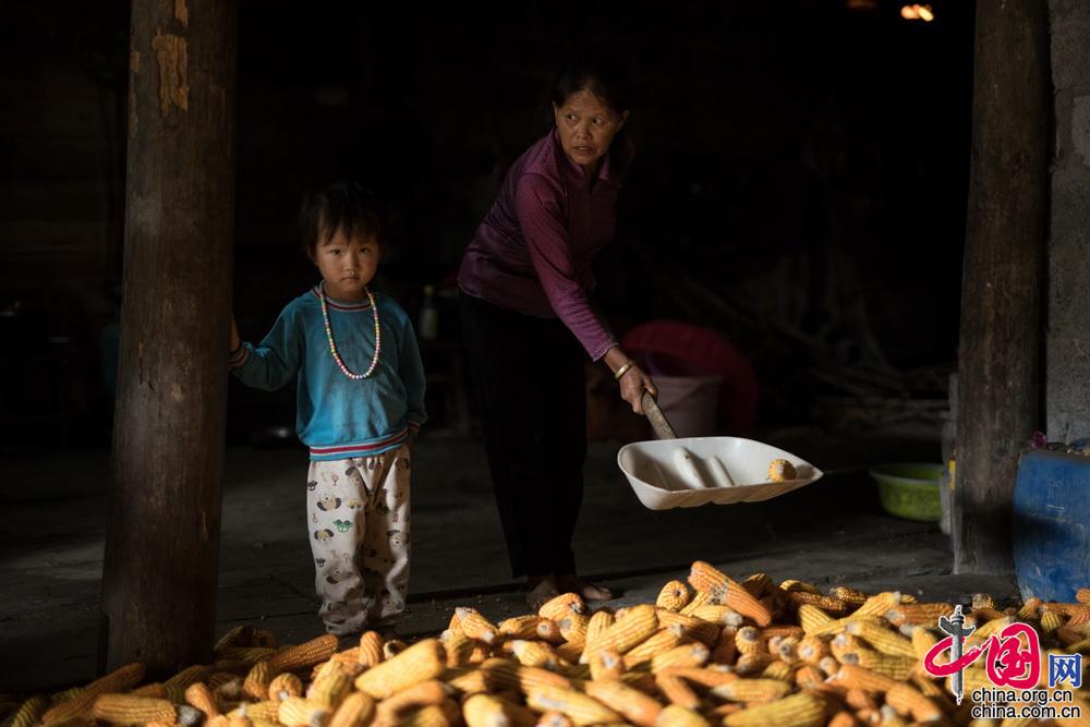 蒙秋华的奶奶在堂屋中整理全家人的主要口粮,4岁的妹妹蒙晓娟待在一旁,她有点怕生。顾磊 摄影