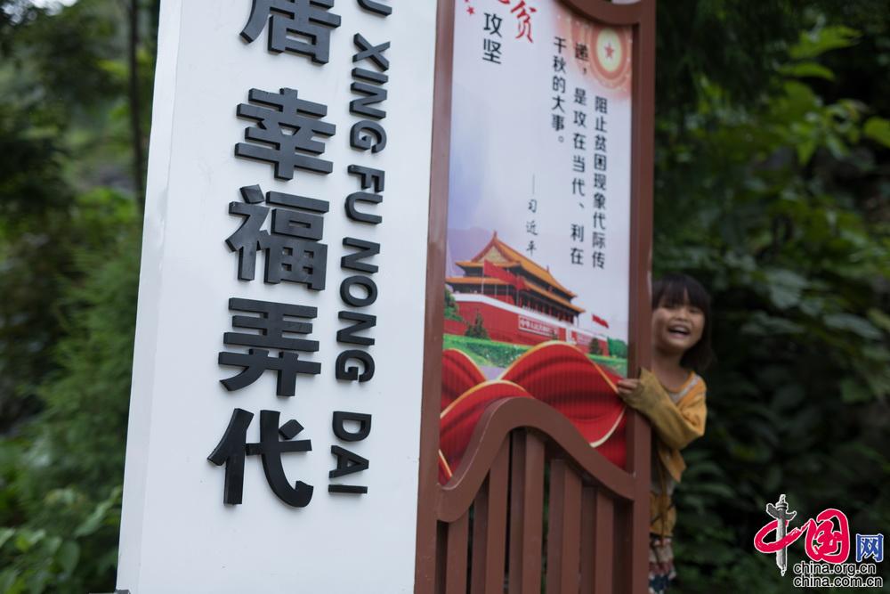 6岁的妹妹蒙艳丹在村口玩耍。胜利村是曾经的最贫困村。2017年建档立卡户动态调整后,该村贫困发生率一度达到93.44%。顾磊 摄影