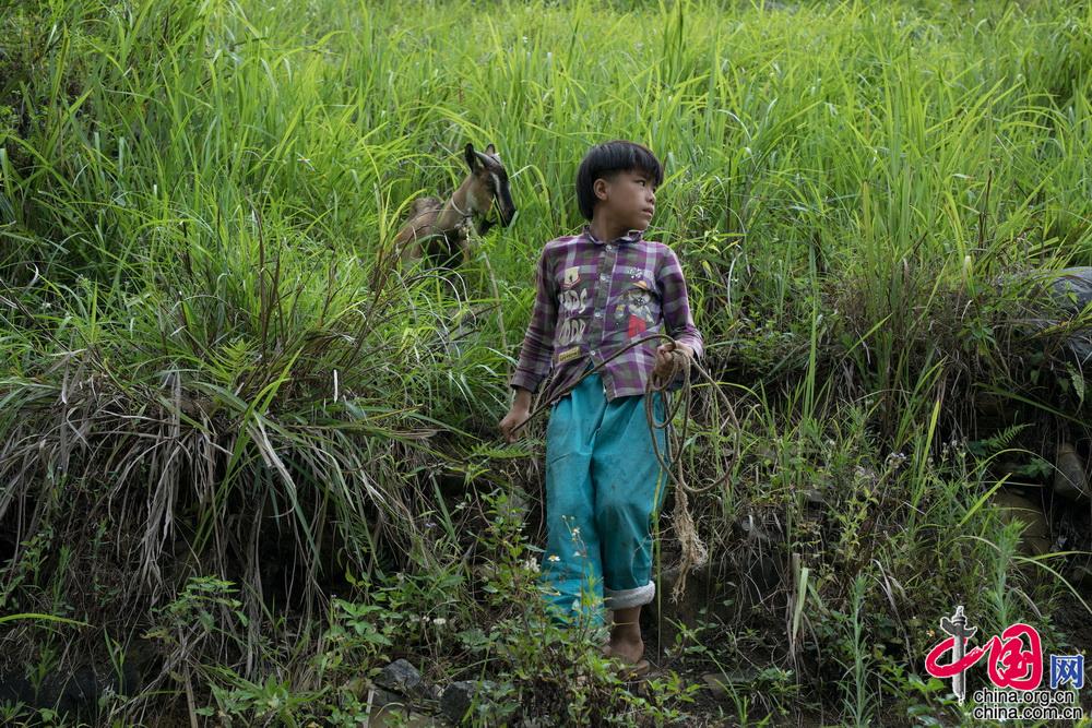 蒙运飞是妈妈的贴心助手,会替妈妈照顾妹妹,让妈妈可以好好干农活,还帮妈妈分担家务,劈柴做饭,洗碗都能干。暑假,他管着家里的两只羊。顾磊 摄影