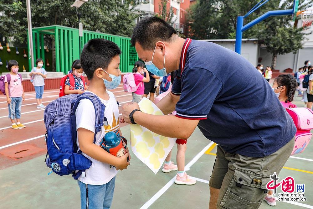 8月29日,北京市对外经贸大学附属小学一年级小学生入校,学生进入教室前,老师在操场对入学新生进行分班登记,并为学生贴上学校吉祥物“阳阳”的贴纸。。中国网 郑亮摄影