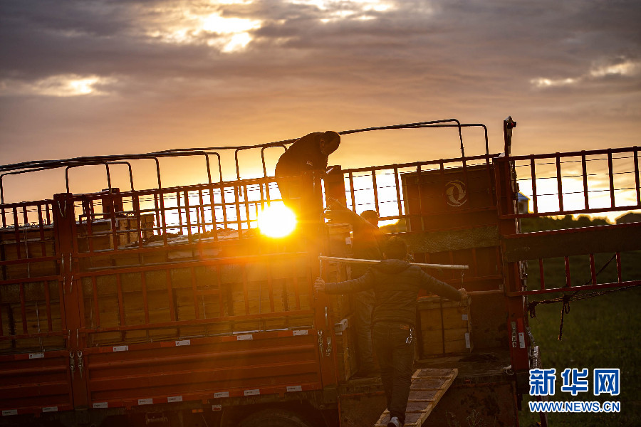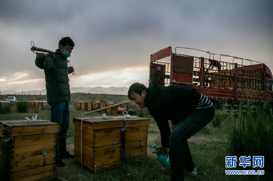 为了让蜜蜂“追花夺蜜”,努尔木拜的同行者正将蜂箱挑上转运的卡车前往新蜂点。 新华网 杲均丰 摄