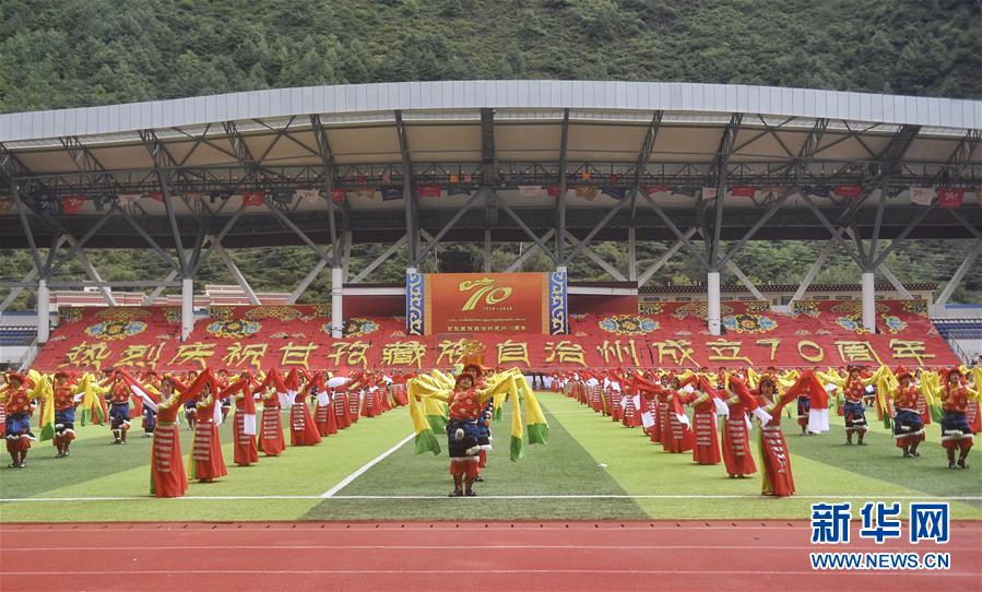 9月17日,群众在甘孜藏族自治州成立70周年庆祝大会上进行文艺演出。 当日,四川甘孜藏族自治州成立70周年庆祝大会在康定市举行。各地群众身着缤纷多彩的民族服饰,载歌载舞,共庆建州70周年。 (新华社记者 刘坤 摄)