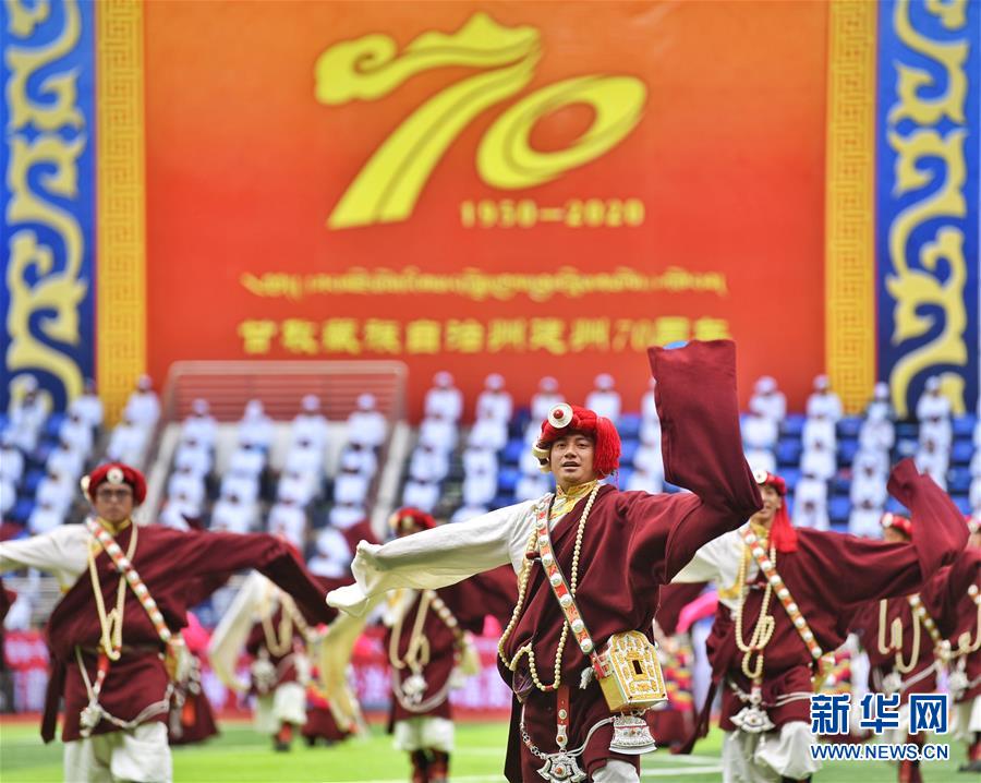 9月17日,群众在甘孜藏族自治州成立70周年庆祝大会上进行文艺演出。 当日,四川甘孜藏族自治州成立70周年庆祝大会在康定市举行。各地群众身着缤纷多彩的民族服饰,载歌载舞,共庆建州70周年。 (新华社记者 刘坤 摄)