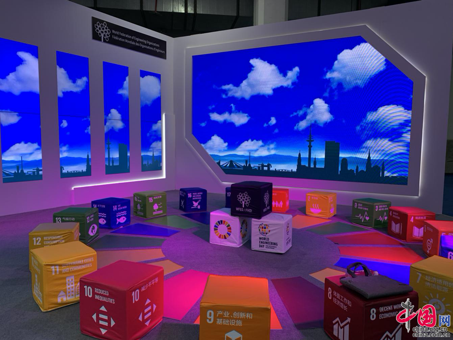 世界工程组织联合会(WFEO)展区面积为200平方米,主要由三部分组成。在展区的第一部分,主要由17块屏幕排列组合而成,在每块屏幕上分别展示工程技术和工程师在推动实现联合国可持续发展目标(SDGs)的每一个目标中,所付出的努力以及做出的贡献。可持续发展是全人类共同的责任,对于工程师群体来说,也责无旁贷。在联合国发布的《2019年全球可持续发展报告》中,提出了科学技术是实现2030年17个可持续发展目标的四个杠杆之一。只有切实发挥好工程技术这根杠杆的作用,才能撬动可持续发展伟大目标的实现。