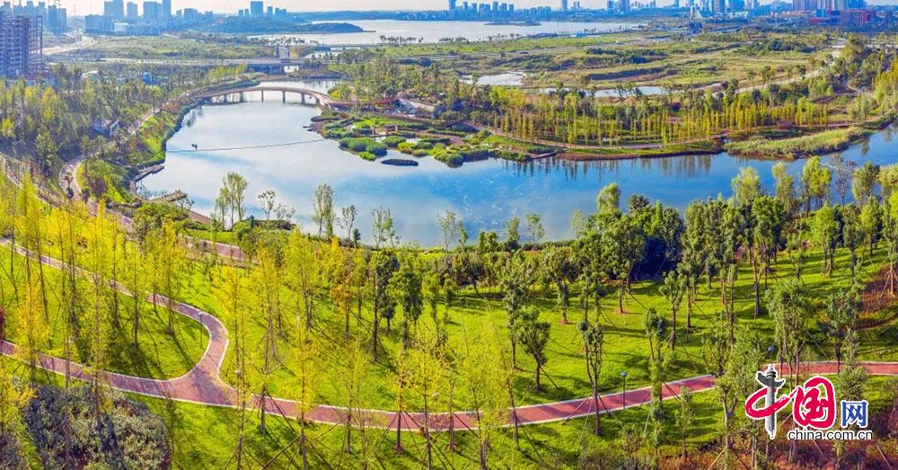 从绿水青山到“人城境业”高度融合,图为成都市新津区红石涵养湿地公园。