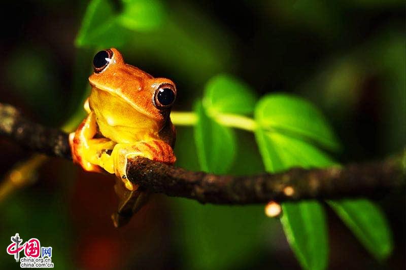 这是红蹼树蛙的“体操表演”。红蹼树蛙躯体灵活柔软,拥有巨大的脚蹼,可以在树枝间灵活移动。(范毅 摄)