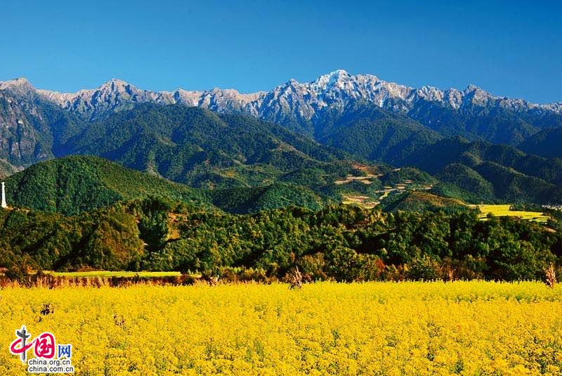 “四季”高黎贡。每年二三月,从西坡看,高黎贡山脊白雪皑皑,山麓却油菜花怒放,瓜果飘香。(艾怀森摄)
