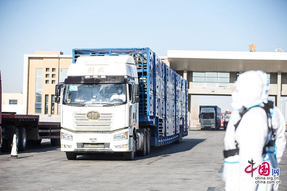 11月13日,载羊车辆从内蒙古出入境边防检查总站二连出入境边防检查站绿色通道快速通关。郭鹏杰摄影