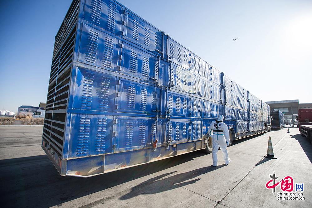 11月13日,内蒙古出入境边防检查总站二连出入境边防检查站执勤民警对载羊车辆进行车体检查。郭鹏杰摄影