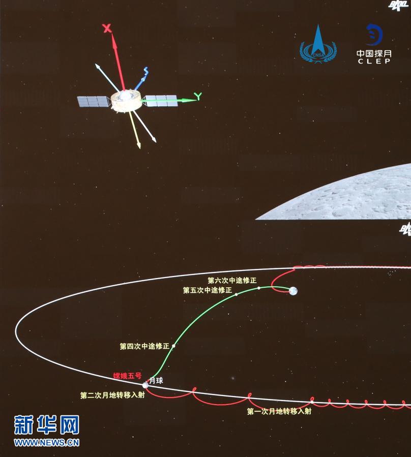 这是嫦娥五号轨道器和返回器组合体实施月地转移入射和中途轨道修正的示意图。