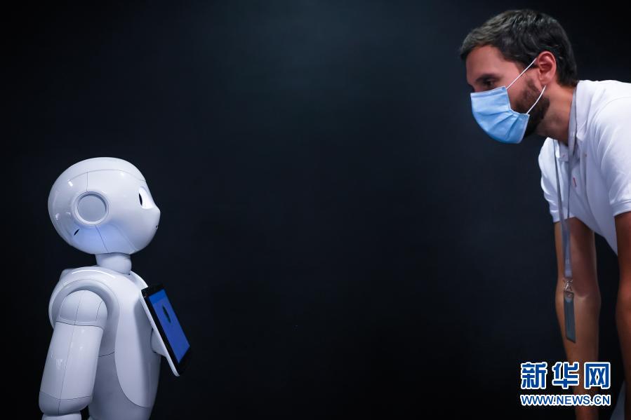 9月10日,在法国巴黎的软银机器人公司,机器人Pepper展示检测人们是否正确佩戴口罩的功能。软银机器人Pepper通过自带的摄像头扫描人脸,检测对方有没有佩戴口罩,并给予礼貌提醒和指导。新华社发(奥雷利安·莫里萨尔摄)