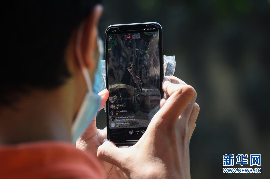 5月17日,在印度尼西亚雅加达,人们通过手机观看拉古南动物园的视频直播。受新冠疫情影响,拉古南动物园对游客关闭后举行网络视频直播,让人们可以“云”游动物园。新华社发(阿贡摄)