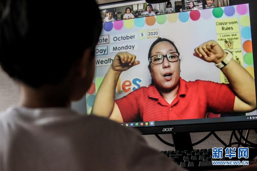 10月5日,在菲律宾马尼拉,5岁的格雷森·卢卡斯开学第一天上网课。为应对新冠疫情,菲律宾开学后通过线上平台网络教学。新华社发(乌马利摄)