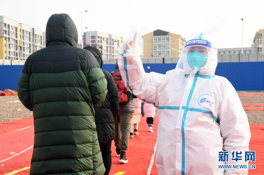 2021年1月2日,在北京市顺义区旺泉街道一处临时核酸检测采样点,工作人员(右)提醒被检测人员保持一米距离。