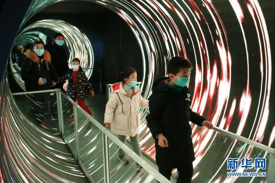 1月2日,孩子们在南京科技馆通过“眩光通道”。