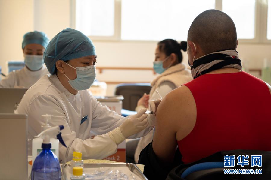 2021年1月3日,在位于北京市西城区广安门外街道红莲社区卫生服务站的接种点,医护人员为接种人员注射疫苗。