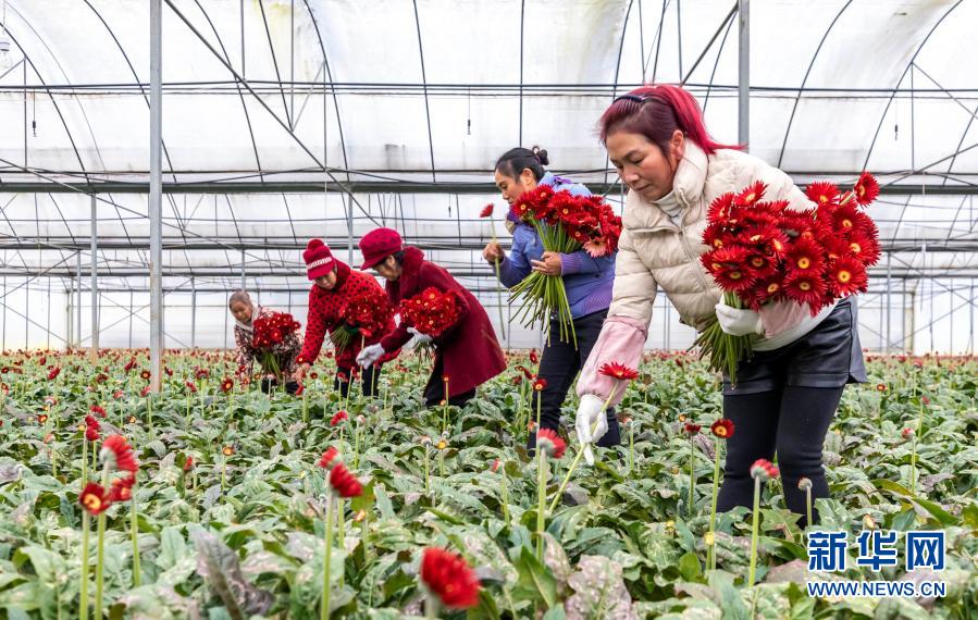 近年来,贵州省黔西县协和镇以“企业+合作社+农户”的模式,发展鲜花种植产业,促进居民在家门口就业增收。元旦假期,村民们忙着在大棚内采收鲜花,供应市场,大棚内花香四溢。