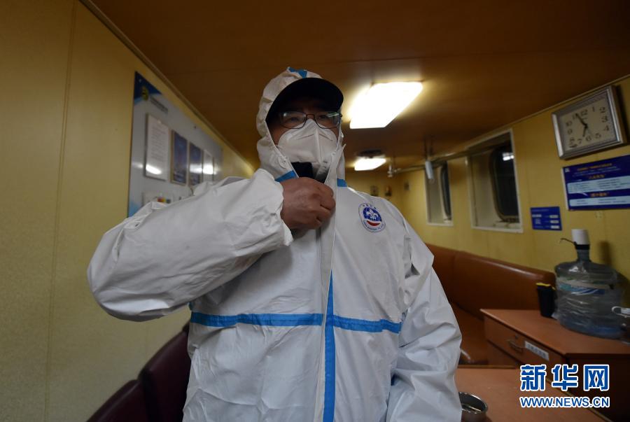 2020年12月28日,天津港引航中心引航员杨胜利在一艘拖轮上穿上防护服,他即将登上一艘船舶,将船引航离港。
