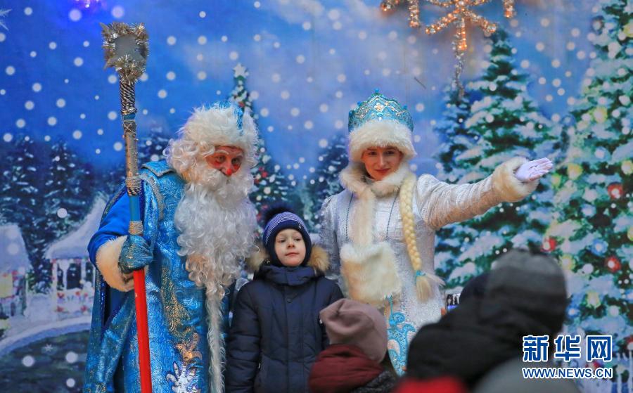 1月2日,在白俄罗斯首都明斯克,打扮成“严寒老人”和“雪姑娘”形象的演员在儿童铁路一处车站与一名儿童合影。