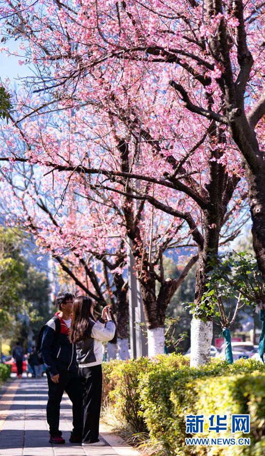 新年伊始,云南昆明市的冬樱花盛开,引人驻足。