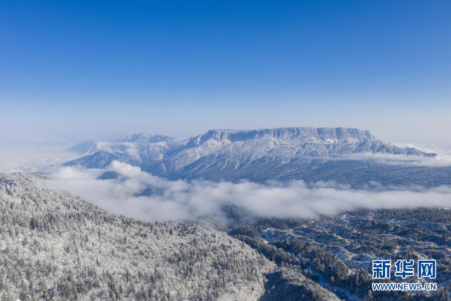 从龙苍沟国家森林公园远眺瓦屋山的景色(2021年1月2日摄,无人机照片)。