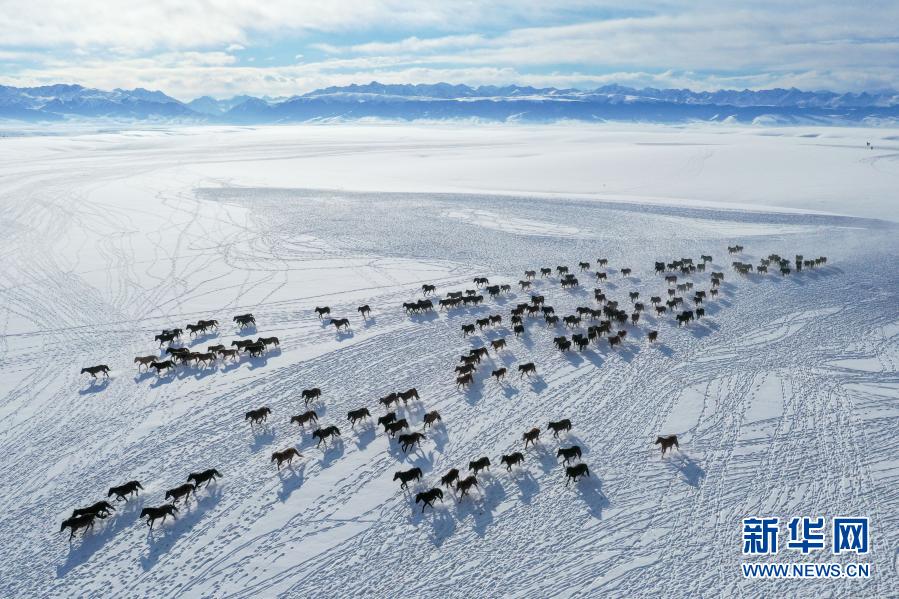 这是在新疆伊犁哈萨克自治州昭苏县天马旅游文化园拍摄的奔驰的马群(2020年12月20日摄,无人机照片)。