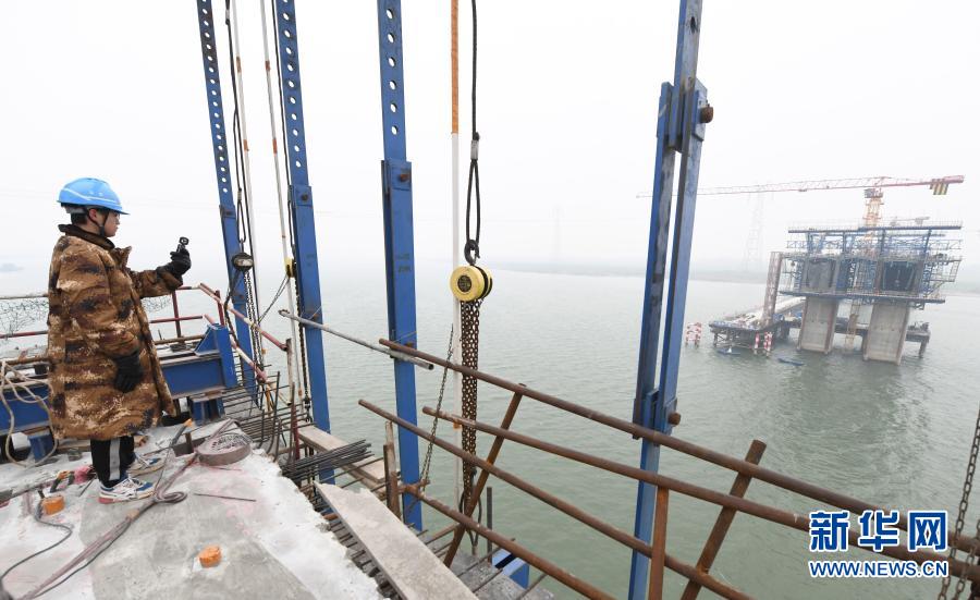 1月5日,中交三航局技术人员在湖北省沙洋县汉江二桥工程工地测量风速。