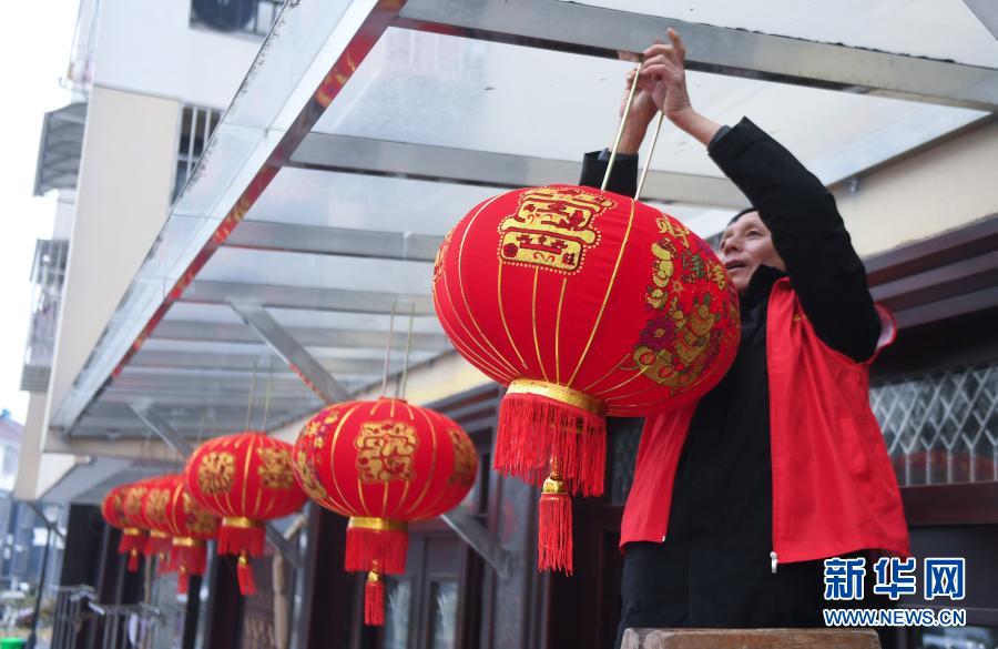 1月5日,东林镇星华村的党员志愿者在新农村新居给村民挂红灯笼。