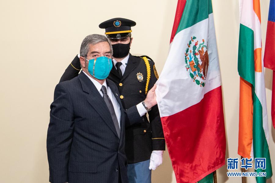 1月4日,在位于纽约的联合国总部举行的新任安理会非常任理事国国旗安放仪式上,墨西哥常驻联合国代表胡安·拉蒙·德拉富恩特与墨西哥国旗合影。