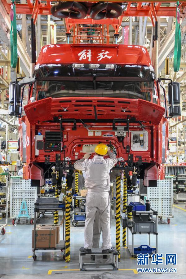 工人在位于长春的一汽解放总装车间装配车辆(2021年1月5日摄)。