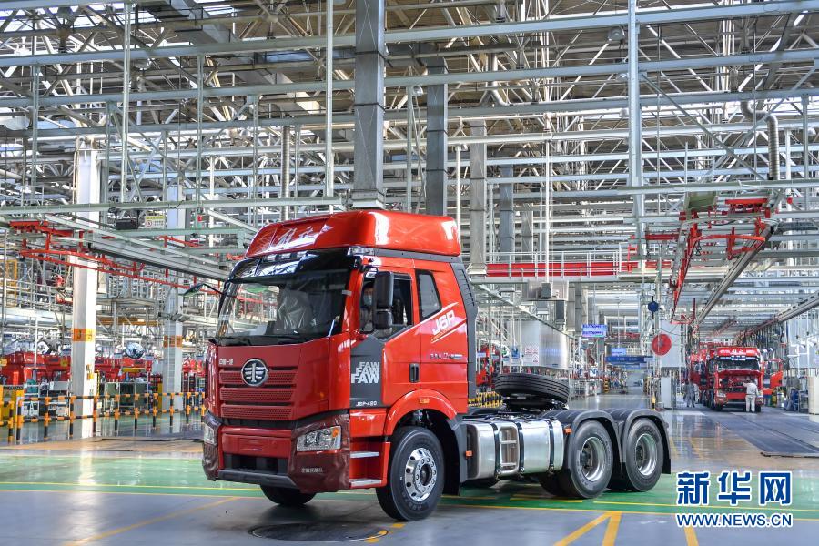 在位于长春的一汽解放总装车间,车辆驶下生产线(2021年1月5日摄)。新华社记者 张楠 摄