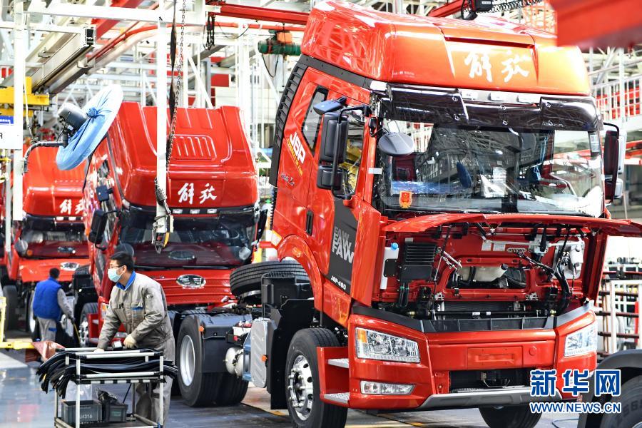 工人在位于长春的一汽解放总装车间装配车辆(2020年11月23日摄)。新华社记者 张楠 摄