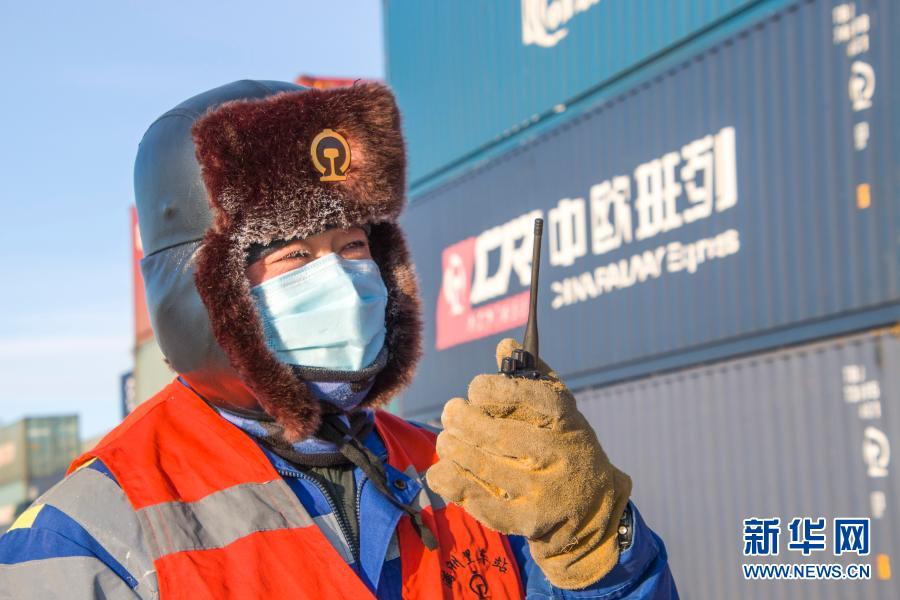 满洲里站集装箱场工作人员通过对讲机与货运值班室和龙门吊司机进行沟通,以确保装卸作业安全(2020年12月30日摄)。