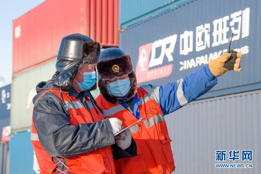 满洲里站集装箱场工作人员对中欧班列的箱位、箱号等信息进行核对(2020年12月30日摄)。
