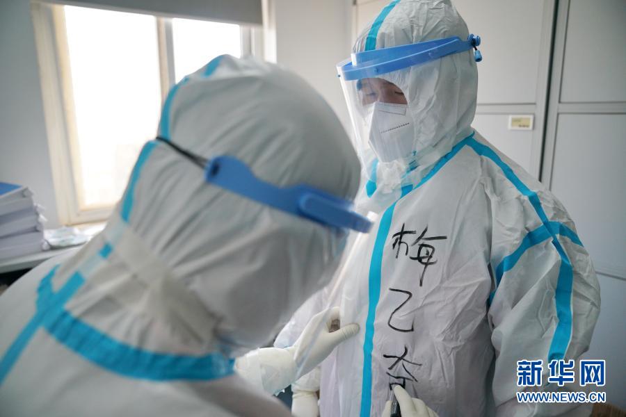 1月8日,同事左林在给梅乙奇(右)的防护服上写名字。(新华社记者 牟宇 摄)