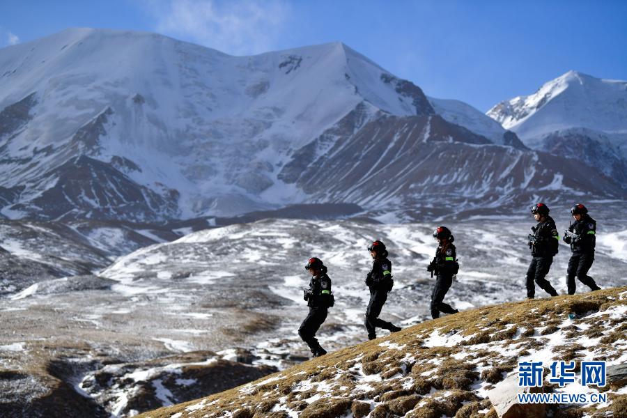 1月9日,青海省果洛藏族自治州公安局特警支队直属女子中队的队员们在阿尼玛卿山脚下参加高原野外适应性训练。新华社记者 张龙 摄