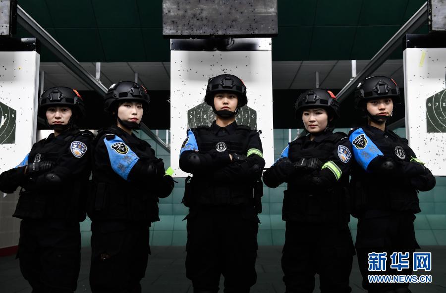 1月9日,青海省果洛藏族自治州公安局特警支队直属女子中队的队员在射击训练馆合影。新华社记者 张龙 摄