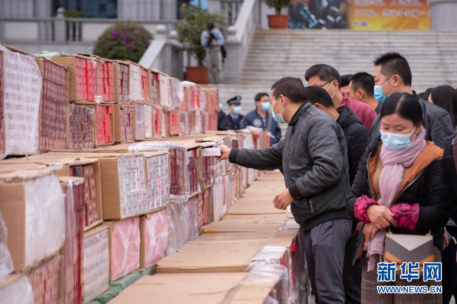 1月10日,市民在云南省普洱市公安局参观“7·22”特大跨境销售假冒注册商标卷烟网络案查获的假烟。