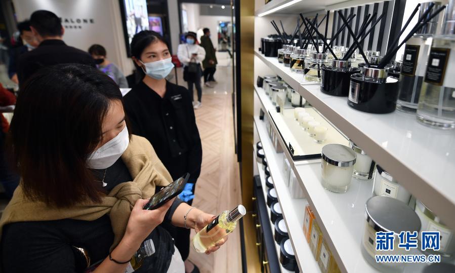 1月7日,顾客在海口日月广场免税店选购香水。