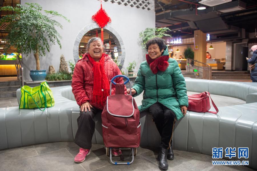1月5日,在改造完毕的嘉兴市南湖区杨柳湾幸福里菜市场,两名老人在休息区休息。