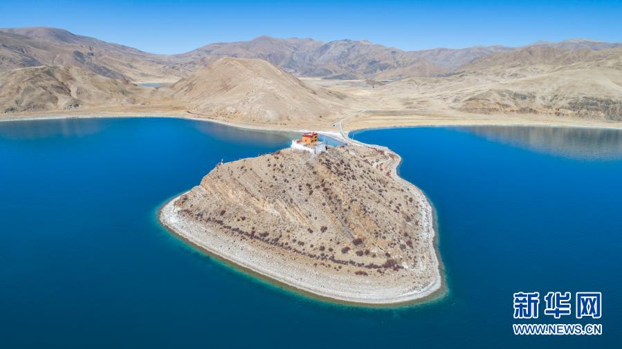 坐落于羊湖北岸一座小岛上的日托寺(无人机照片,1月10日摄)。