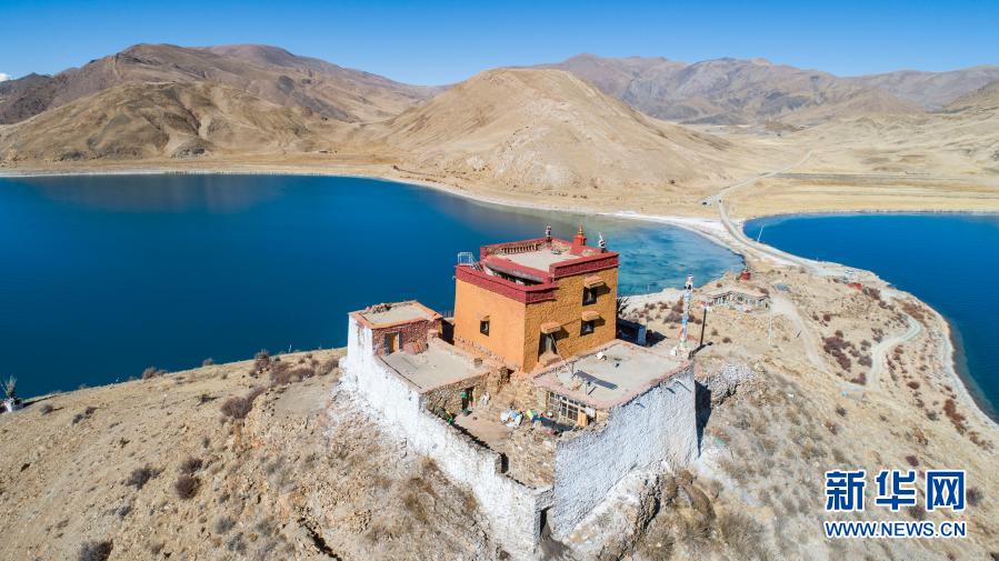 坐落于羊湖北岸一座小岛上的日托寺(无人机照片,1月10日摄)。