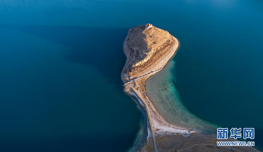 落日余晖下,日托寺的影子倒映在羊湖湖面(无人机照片,1月9日摄)。