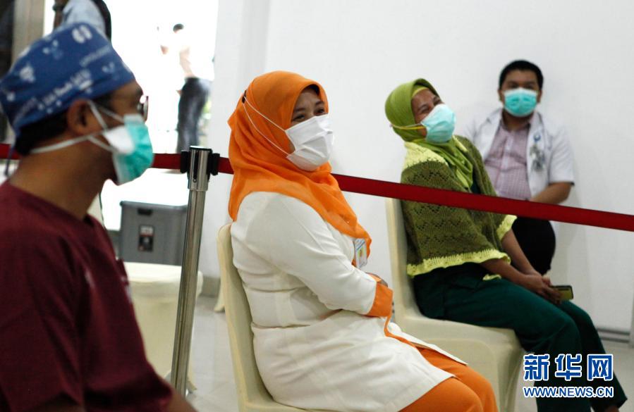 1月14日,在印度尼西亚雅加达的西普托·曼贡库苏莫医院,医务工作者排队等待接种中国科兴公司的克尔来福新冠疫苗。印尼已在全国范围内启动新冠疫苗接种工作,分阶段为全民免费接种疫苗。第一阶段优先接种人员为全国130万名医卫工作者。新华社记者叶平凡摄