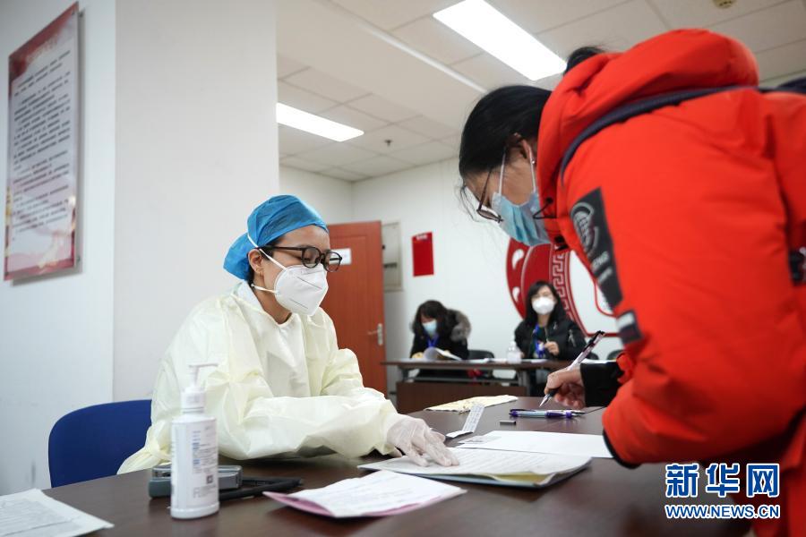 1月14日,在北京市东城区崇外街道临时接种点,北京市东花市社区卫生服务中心的工作人员(左)在为接种人员讲解疫苗接种注意事项。