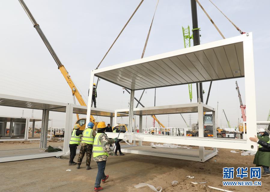 1月15日,工人在石家庄黄庄公寓隔离场所项目工地安装集成房屋。