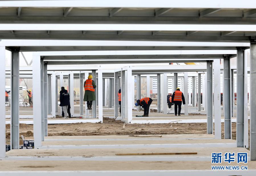 1月15日,工人在石家庄黄庄公寓隔离场所项目工地安装集成房屋。