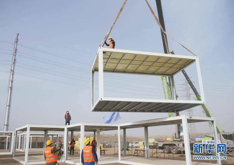 1月15日,中铁建工集团的工人在石家庄黄庄公寓隔离场所项目工地安装集成房屋。