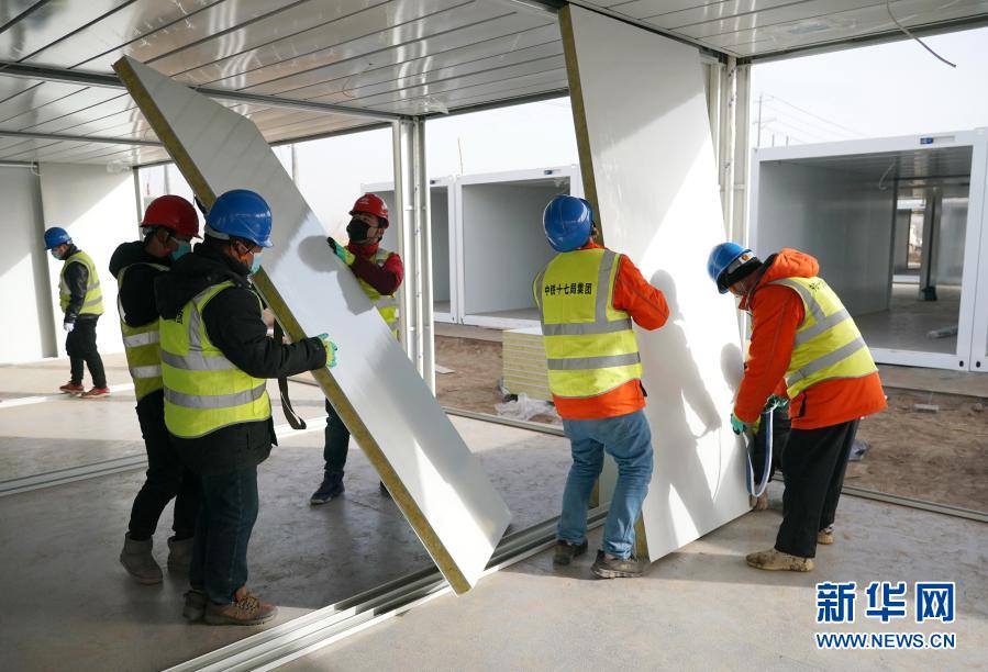 1月15日,工人在石家庄黄庄公寓隔离场所项目工地安装集成房屋。