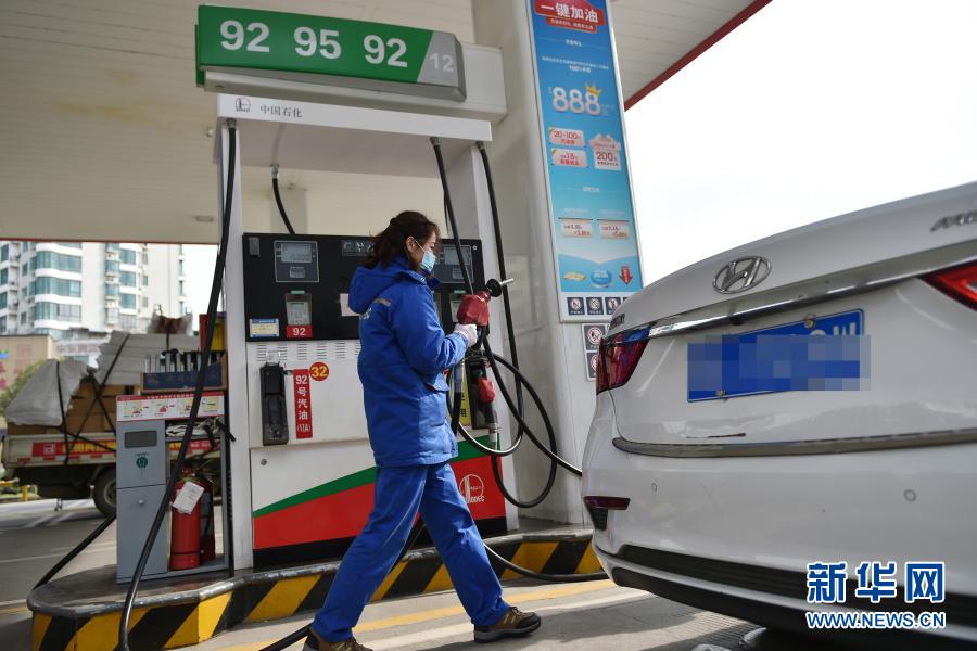 1月15日,江苏省南京市雨花台区一加油站的工作人员提着油枪准备给车辆加油。